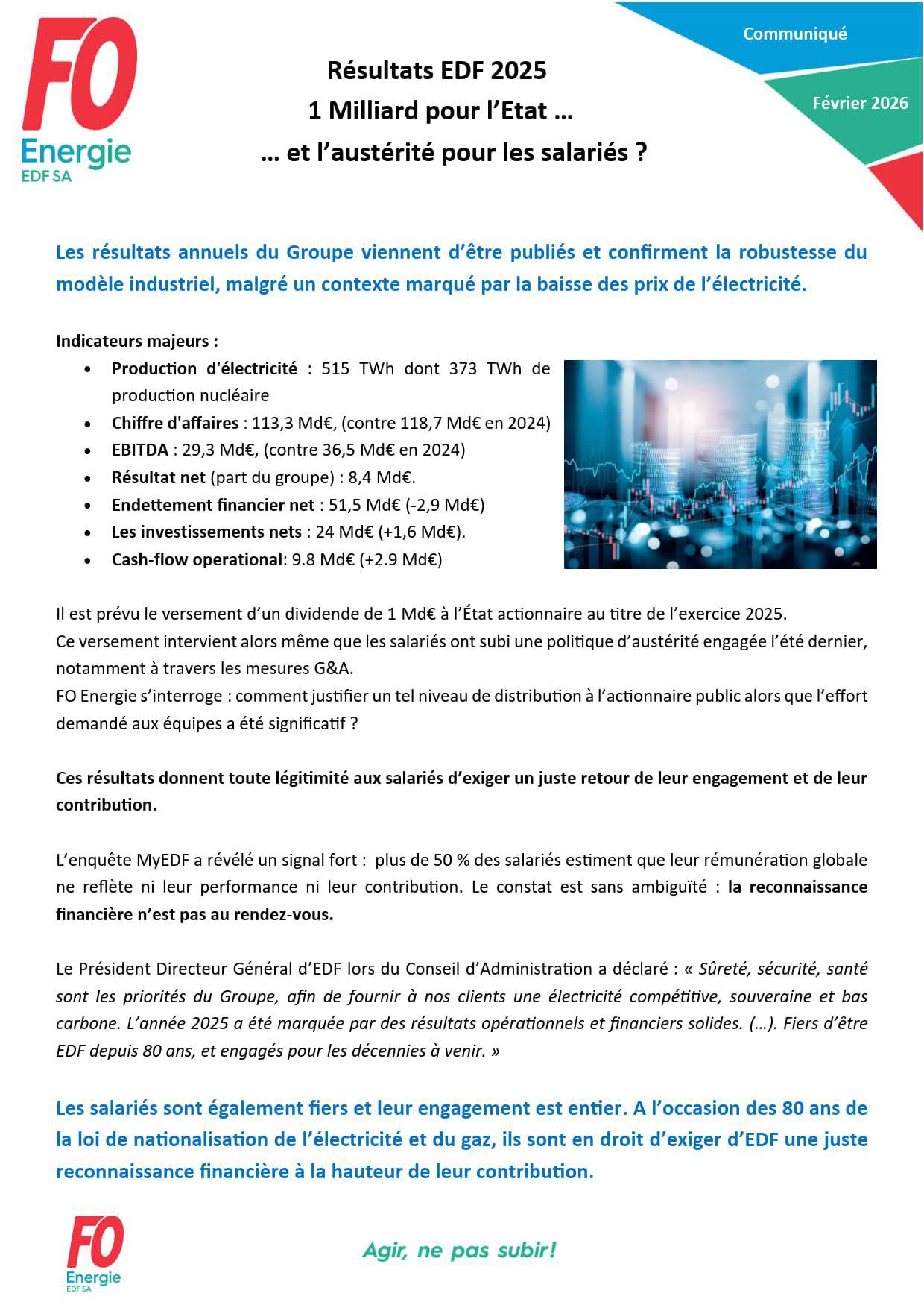 [EDF SA] Résultats EDF 2025 – 1 Milliard pour l’État… et l’austérité pour les salariés ?